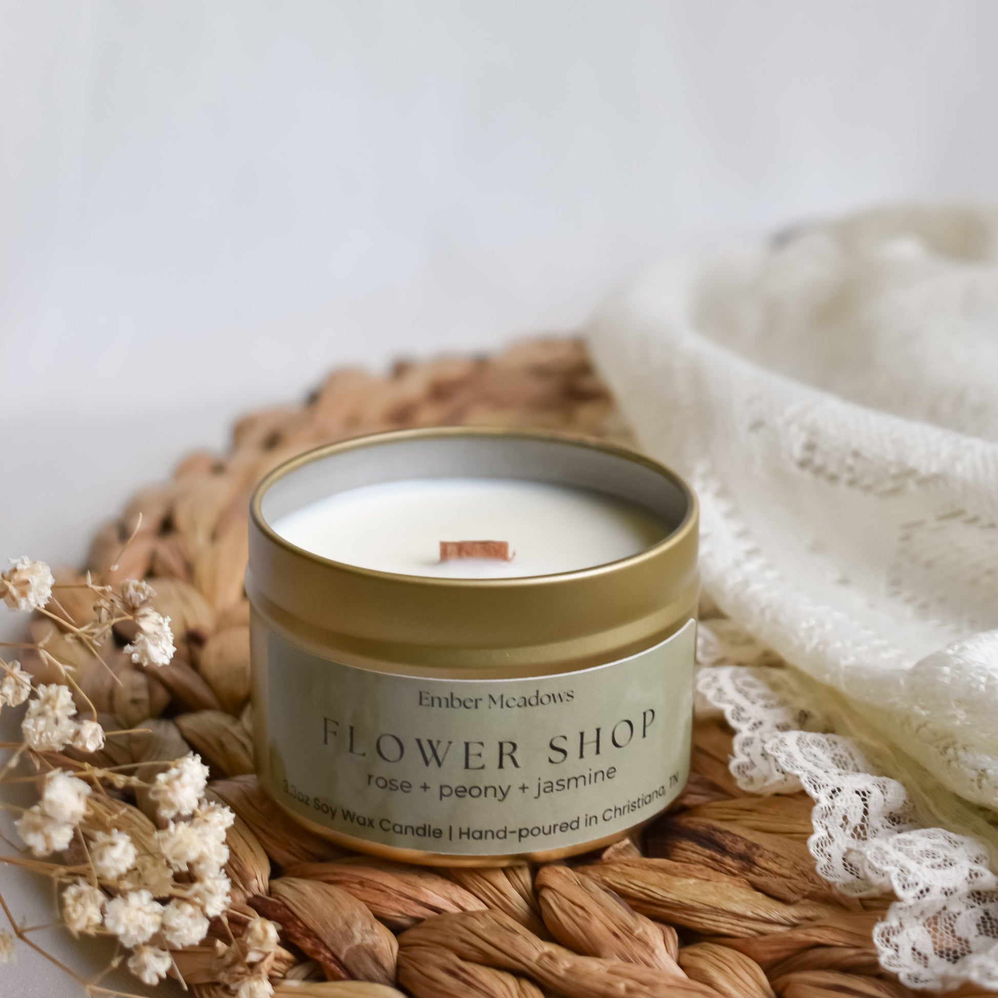 Our signature fragrance blend. The sweet, airy notes of rose, jasmine, and peony bloom gracefully, capturing the essence of a flower shop. A hint of cedar adds depth and warmth to perfectly balance the florals.